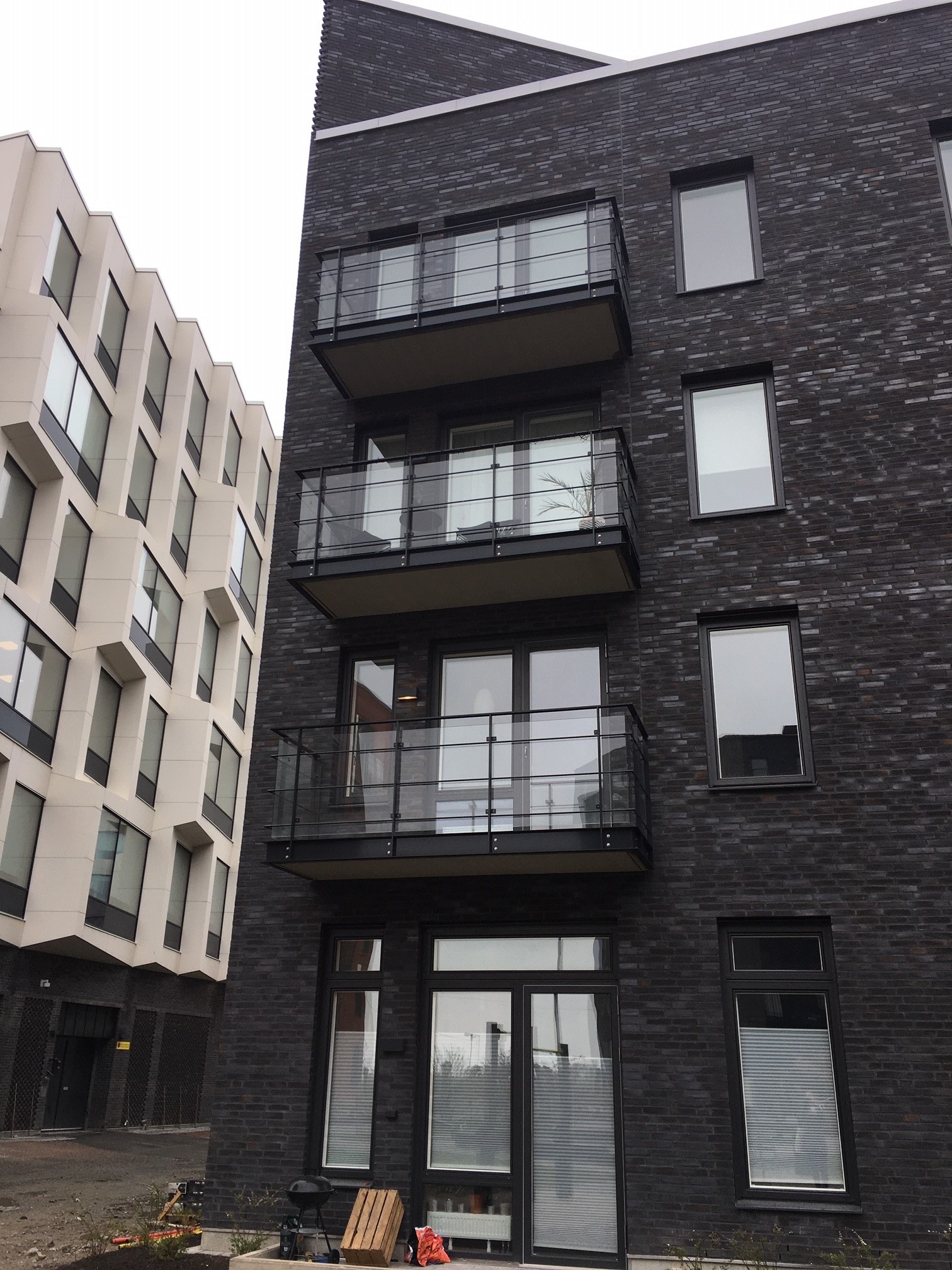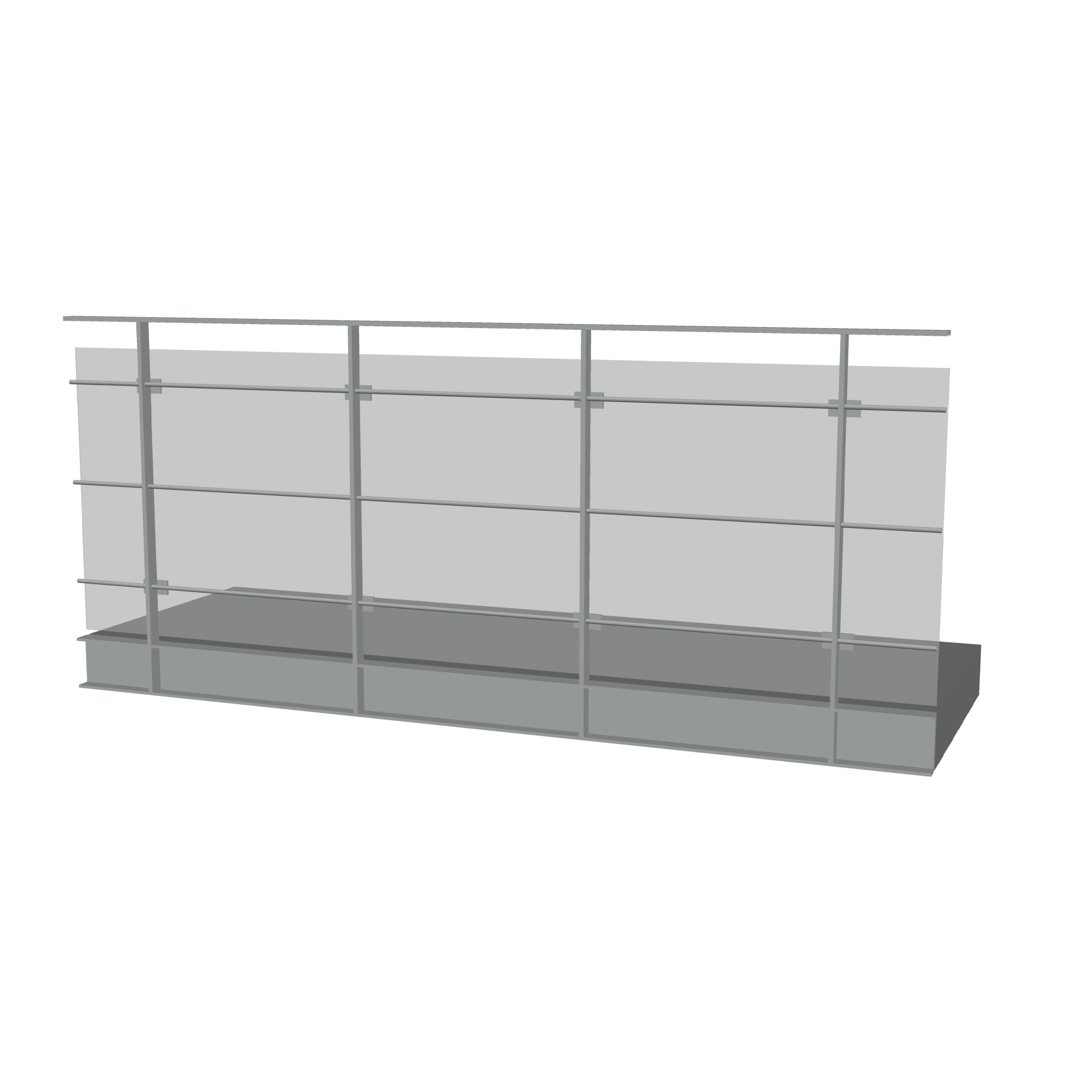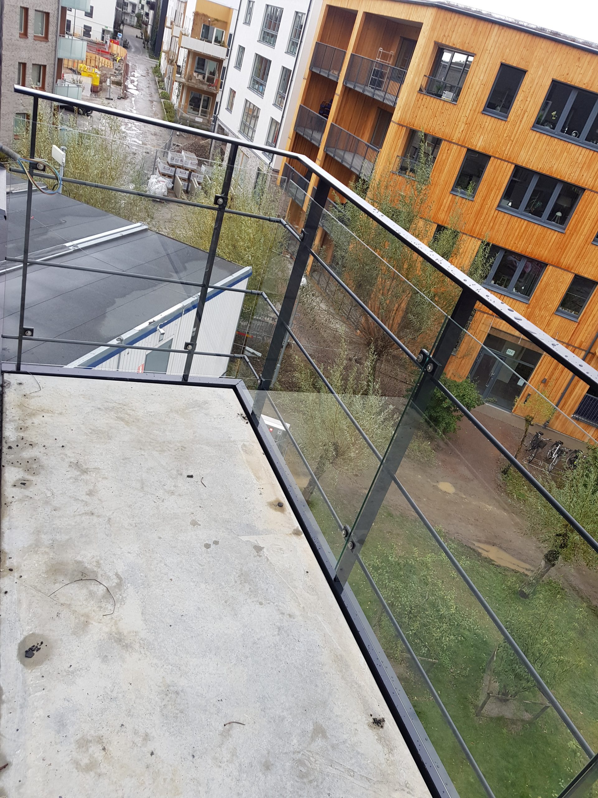 Ett glasräcke i aluminium, designat för att efterlikna ett smidesräcke.